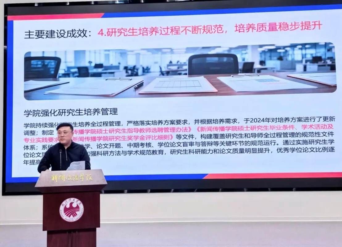 新闻学系刘娟、播音与主持艺术系陈强、广播电视编导系方俊、视觉传达设计系张喆先后发言。汇报聚焦人才培养质量、课程教学改革、实践创新成果与师资队伍建设等方面。